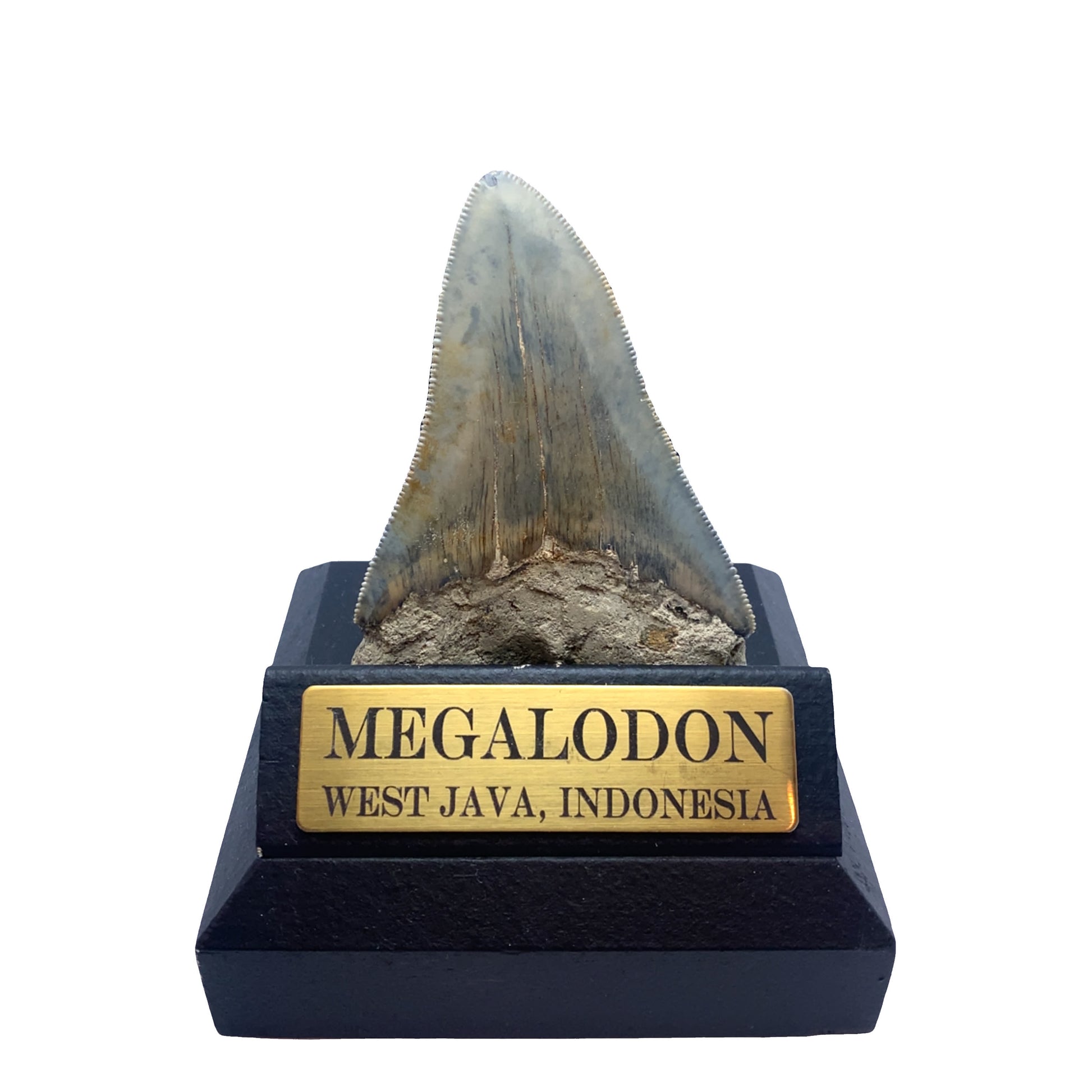 This impressive 93mm Fossilized Megalodon Tooth from West Java, Indonesia, showcases a remarkable blend of colors and textures. The tooth features deep charcoal gray edges transitioning to lighter steel gray towards the center, complemented by earthy brown tones at the base with subtle hints of olive green. The glossy enamel section highlights delicate striations, while the root has a rough, fossilized sediment. The serrations along the edges are sharply defined. Mounted on a sleek black base with a golden nameplate, it is a captivating display piece.